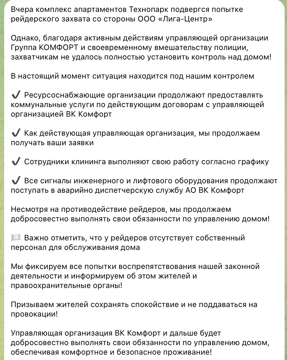 Официальное сообщение управляющей компании «ВК Комфорт» в канале: https://t.me/technopark_news/5978