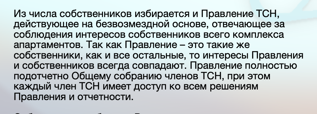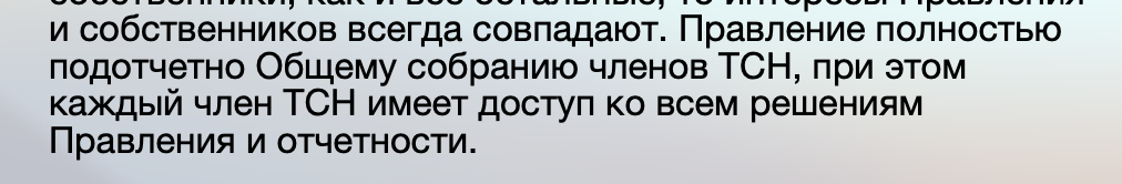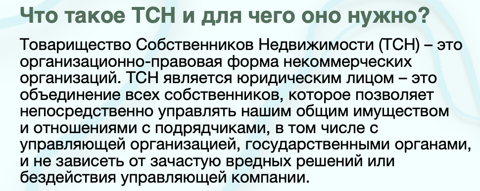 При выборе ТСН все собственники, не входящие в Правление ТСН — и члены ТСН, и не входящие в ТСН собственники — утратят возможность распоряжаться общедомовым имуществом. Решение будут принимать 2/3 членов Правления Товарищества, состоящее всего из 13 человек, то есть 8-9 человек.