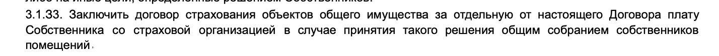 Также мы обратили внимание на то, что в договоре управления УК Butler (ООО «Лига Центр»), которую инициаторы ТСН пытались привести в наш ЖК через прошлый ОСС, указано, что страхование ОДИ осуществляется по решению собрания и только ЗА СЧЁТ собственников.